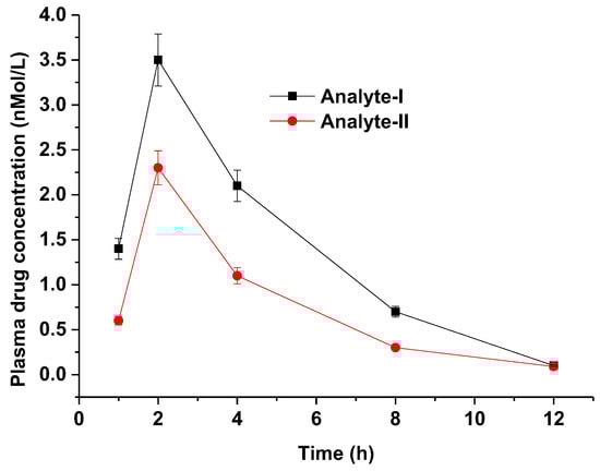 Plasma drug concentration time profile of analyte I and analyte II in rats after oral administration (n = 3, mean ± standard deviation). The graph was generated using Origin Pro 9.0 software (trial version, One Roundhouse Plaza, Northampton, MA, USA).