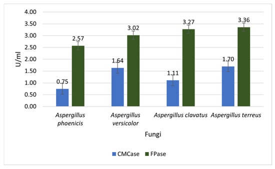 The enzymatic activity (CMCase and FPase) of all four test Aspergillus strains (i.e., A. clavatus, A. versicolor, A. terreus and A. phoenicis) was evaluated and is shown in Figure 1.