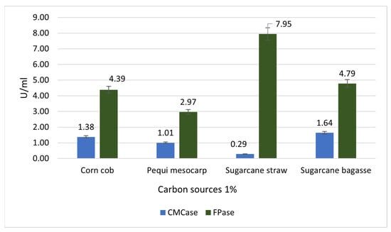 After the selection of A. terreus NIH2624 as the fungus of study, four different carbon sources, i.e., corn cob, pequi mesocarp, sugarcane straw and sugarcane bagasse, were evaluated for cellulase production. The cellulase production profile of A. terreus NIH2624 growing on these carbon sources is presented in Figure 2.