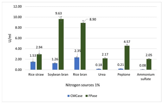 The analysis demonstrated that A. terreus NIH2624 showed the maximum enzymatic activity (CMCase activity of 1.70 U/mL and FPase activity of 3.36 U/mL) compared to other strains (Figure 1). Therefore, A. terreus NIH2624 was selected for the further optimization of various carbon and nitrogen sources for cellulase production. The FPase activity (3.35 U/mL) reported in the present study was found to be significantly higher compared to previous studies, whereas CMCase activity (1.69 U/mL) was found to be lower. For example, Hui et al. [17] obtained an FPase value of 1.40 U/mL. Shahriarinour et al. [18] obtained an FPase of 0.69 U/mL and a CMCase of 7.41 U/mL for A. terreus, using peptone as a source of nitrogen in the minimum medium and using cellulose as carbon source. Sohail et al. [19] found lower values of FPase (0.15 U/mL) and CMCase (0.295 U/mL) for A. terreus activity with a mineral salt medium while employing solid-state fermentation. The CMCase value (1.32 U/mL) of this study is like the value found by Silva et al. [20] that used the mutant strain of T. reesei RP698.