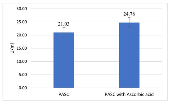 The PASC test was also performed by adding ascorbic acid to analyze the presence of LPMOs, important enzymes that have revolutionized our understanding of the biological degradation of plant cell walls. The PASC test can indicate the presence of endoglucanase and cellobiohydrolase [26]. The addition of ascorbic acid to the test and the observation of increased activity strongly indicates the presence of LPMOs since LPMOs are activated in the presence of an electron donor, which is, in this case, ascorbic acid. Comparing the activity with and without ascorbic acid, we noted an increase of 17.84% in the activity (Figure 4), which suggests the presence of LPMOs in the obtained enzymatic cocktail.