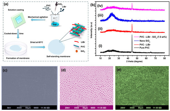 (a) Schematic diagram for solution-casting method; (b) X-ray diffractograms of the prepared films (i) pure PVC, (ii) PVC:LiBr, (iii) Nano SiO2 and (iv) PVC:LiBr:SiO2 (7.5 wt%); (c) SEM image of pure PVC, (d) PVC:LiBr, and (e) PVC:LiBr:SiO2 (7.5 wt%).