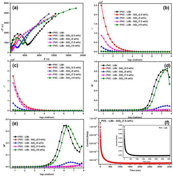 (a) Nyquist plot of PVC:LiBr:SiO2 system at ambient conditions; (b) variation in dielectric permittivity of real and (c) imaginary parts concerning frequency for PVC:LiBr and PVC:LiBr:SiO2 added to system at ambient temperature; (d) frequency dependence of M′ (storage modulus) and (e) M″ (loss modulus) for the PVC:LiBr:SiO2 system at room temperature; (f) plot of current vs. time for PVC:LiBr and PVC:LiBr:SiO2 (7.5 wt%) (maximum ionic conductivity) systems.