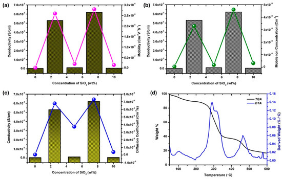 (a) Conductivity and migration vs. nano-SiO2 concentration; (b) conductivity and free ion concentration as a function of nano-SiO2 concentration; (c) conductivity and diffusion coefficient vs. nano-SiO2 concentration; (d) TG/DTA graph for PVC:LiBr:SiO2 (7.5 wt%) system.