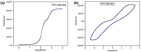 The electrochemical properties of the prepared nano-SiO2-dispersed polymer electrolytes were studied by assembling a symmetry cell like SS|SPE|SS at room temperature. The measurements were carried out at a scan rate of 10 mV/s from 0 V to 4 V. The decomposition voltage of the prepared higher-ionic-conductivity electrolyte can be determined from LSV studies, shown in Figure 4a. The decomposition voltage of the electrolyte was determined above 3 V. The current value gradually increased with increasing applied voltage due to the performance of the conduction due to ions, and it was observed between 2 V and 3 V. The working voltage of the prepared system was found to be below 3 V. The decomposition of electrolytes due to the electrode–electrolyte interface was noted at 4 V, which was reflected in the sudden rise in current values [55,56]. The stability of the electrolyte is a more critical parameter, and it will make enormous changes while moving toward the device fabrication process. A CH instrument was used to study the stability of the electrolyte by making a symmetry cell as SS|SPE|SS at room temperature using the prepared film as the electrolyte [15]. The cyclic ability of the film was carried out in the potential window of −5 to +5 V at a sweep rate of 10 mV, shown in Figure 4b. Broad peaks are observed in the curve due to the interaction among the electrode, electrolyte, and nanofiller SiO2. The prepared electrolytes are suitable for energy storage applications because of the behavior of the cyclic ability of the material, which is observable in the following graph [57,58].