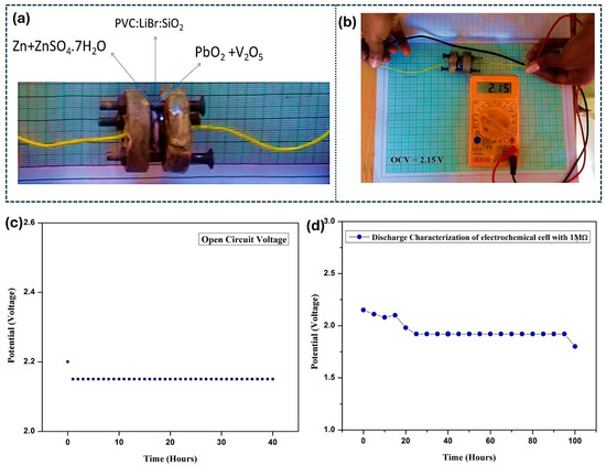 A primary lithium electrochemical cell is constructed using the high ionic conducting polymer film PVC: LiBr:7.5% SiO2 as the electrolyte material. And Zn + ZnSO4.7H2O and PbO2 + V2O5 are the electrode materials (Figure 5a) [51,52,53]. At room temperature, the potential difference across the arranged cell is measured and shown in Figure 5b. An open circuit voltage of 2.15 V is obtained for the fabricated cell Zn + ZnSO4.7H2O|PVC: LiBr: SiO2|PbO2 + V2O5 [59,60,61], and the graph plotted between voltage versus time is shown in Figure 5c, showing that it remains constant for around four days. The reported OCV value is consistent with the electrolyte’s LSV investigations, which provided potential values ranging from 2 to 3 V. Following that, as seen in Figure 5d, the voltage decreases to 1.92 V when discharged through a 1 MΩ load resistance. After several hours, the potential of the prepared cell decreases continuously due to the reaction of the electrolyte with the electrodes [62,63].