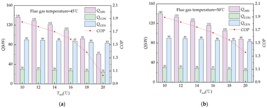 Figure 10 illustrates the impact of variations in Tsol and Tmgi on COP, QABS, QCON, and QGEN. The flue gas temperatures depicted in the figure are 45 °C, 50 °C, 55 °C, and 60 °C. At a flue gas temperature of 45 °C, the system COP decreases gradually with the change in solution temperature. However, once the temperature drops below 16 °C, the system COP begins to decline sharply. When the flue gas temperature exceeds 45 °C, the rate of decline in system COP gradually slows. This is primarily because, as the flue gas temperature increases, the temperature difference in the system becomes significantly larger, enhancing the thermal recovery efficiency of the LiCl solution in the absorber. Consequently, the absorber can release more absorbed heat, which improves the system COP. Therefore, the range of flue gas temperatures in the desulfurization tower needs to be selected based on actual conditions.