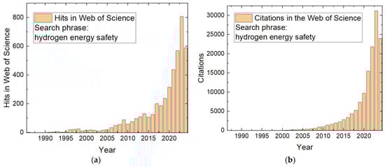 (a) Hits on Web of Science for the search phrase “hydrogen energy safety”; (b) corresponding citations. Data obtained on 18 August 2024.