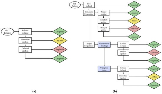 (a) Event sequence diagram for gaseous H2 releases in the Hydrogen Risk Assessment Model (HyRAM 3.0), a tool containing probabilistic information and deterministic models to simulate gaseous hydrogen release; (b) proposed event sequence diagram for liquid H2 releases. Reprinted from [18], with permission from Elsevier.