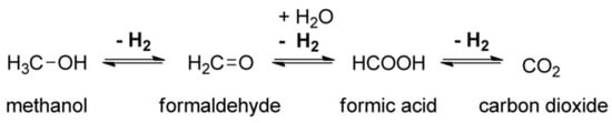Another important step in the process is the production of methanol, which can either be achieved through direct CO2 hydrogenation according to the process 3H2 + CO2 → CH3OH + H2O or through formic acid hydrogenation according to the process HCOOH + 2H2 → CH3OH + H2O [29]. While direct hydrogenation of CO2 is the easier process, the negative enthalpy and entropy of this process may cause limitations. For both processes, different catalysts have been investigated.