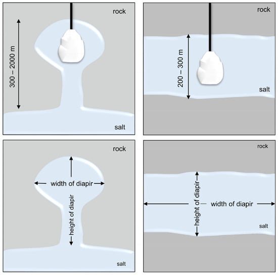 Salt caverns in diapiric deposits salt domes (left) and salt layers (right). From [36], originally published under a CC-BY license.