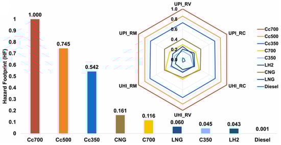 Hazard footprint of the hydrogen SU concepts and benchmarks considered in the analysis. Here, Cc—denotes cryo-compressed gas, with the number giving the pressure in bar; CNG is compressed natural gas; C—defines compressed gas, with the number giving the pressure in bar; LNG (liquefied natural gas) and LH2 (liquid hydrogen) are the respective cryogenic liquids; and diesel is used as a liquid. Reprinted from [120], originally published under a CC-BY license.