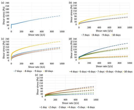 Flow curves for the water-based fluid at room temperature (a) and after exposure to 95 (b), 110 (c), 140 (d), and 150 °C (e).