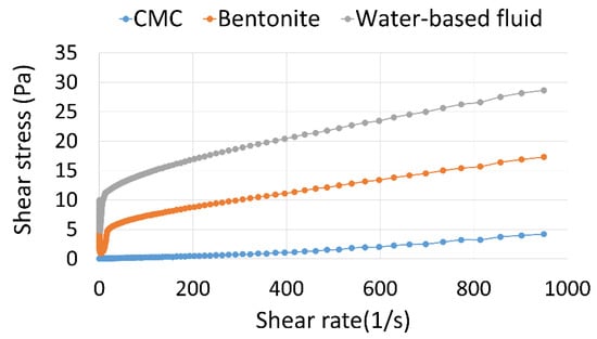 Flow profiles of the water-based fluid, saline dispersion of bentonite clay, and saline solution of CMC after exposure to 150 °C for 5 days.