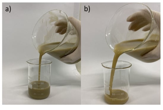 Aspects of the saline dispersion of bentonite clay at room temperature (a) and after exposure to 150 °C for 5 days (b).
