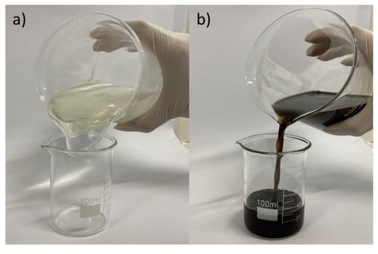 Aspects of the saline solution of CMC at room temperature (a) and after exposure to 150 °C for 5 days (b).