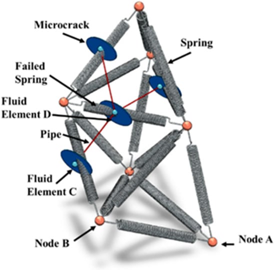 The traditional Particle Flow Code (PFC) models rock as an assembly of rock particles and cementing materials, simulating the mechanical behavior of the rock. The 3D lattice method simplifies this approach by representing rock particles as mass-bearing nodes and the cementing materials between particles as springs that connect two nodes, as illustrated in Figure 1. This simplification enhances the computational efficiency of the 3D lattice method. Fluid nodes are positioned in the middle of the springs, and two connected fluid nodes form a pipe through which fluid flows. Using the Xsite (2.0.77) software to implement the 3D lattice method.