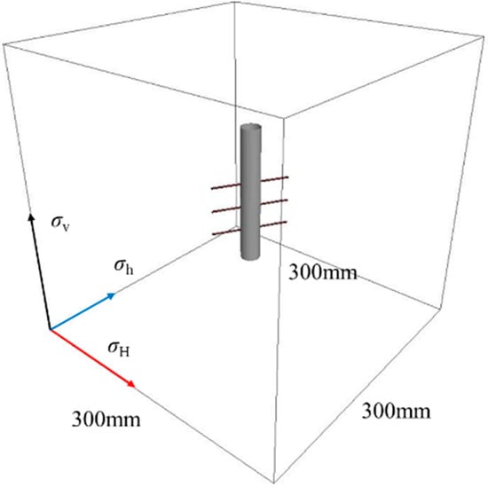 In their research, Fu et al. [] demonstrated that increasing perforation depth can effectively reduce the fracture initiation pressure. Therefore, in this study, different perforation depths within the same perforation cluster were set, a method referred to as controlled-depth directional perforation. To analyze the impact of different perforation patterns on fracture initiation, a cubic model with dimensions of 3 m by 3 m by 3 m was established. The minimum horizontal principal stress, σh (33 MPa), was applied in the X direction; the maximum horizontal principal stress, σH (47 MPa), was applied in the Y direction; and the overburden stress, σv (52 MPa), was applied in the Z direction.