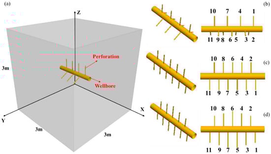 Directional perforation (Figure 5c): The model includes 11 perforations, all perpendicular to the wellbore, with all perforations alternating along the direction parallel to the vertical stress.