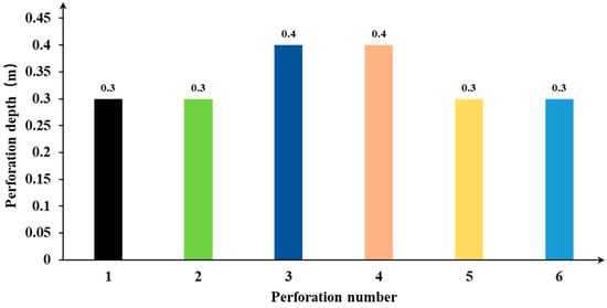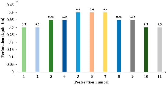 Controlled-depth directional perforation (Figure 5d): The model includes 11 perforations, all perpendicular to the wellbore, with all perforations alternating along the direction parallel to the vertical stress. The detailed distribution of perforation depths is shown in Figure 6.