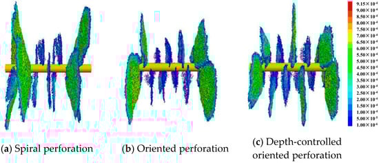 Figure 7 and Figure 8 display the near-wellbore fracture morphology of spiral perforation, oriented perforation, and depth-controlled oriented perforation. The calculation results revealed that the hydraulic fractures propagated on both sides of spiral perforation and directional perforation, exhibiting a tendency to propagate in both directions. The intermediate perforation failed to generate an effective hydraulic fracture due to the stress shadow effect. Depth-controlled oriented perforation improved uneven fracture initiation, allowing for the effective formation of hydraulic fractures, including the middle perforation.
