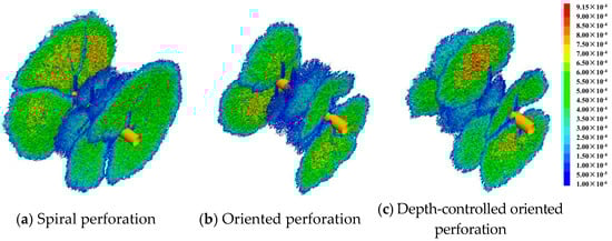 For this study, all three perforation schemes utilized identical rock parameters and injection schemes. The rock exhibited an elastic modulus of 30 GPa, a Poisson’s ratio of 0.21, a uniaxial compressive strength of 120 MPa, and a tensile strength of 7.2 MPa. Roller far-field boundary conditions were applied to six faces.