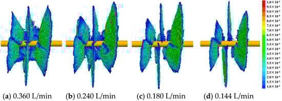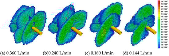 To analyze the influence of fracturing fluid injection rate on fracture initiation and the propagation morphology of depth-controlled oriented perforation while maintaining a consistent total injection volume of fracturing fluid, hydraulic fracturing simulations were conducted at flow rates of 0.360 L/min, 0.240 L/min, 0.180 L/min, and 0.144 L/min. According to the calculation results, it can be seen that the depth-controlled oriented perforation effectively ensured the uniform initiation of hydraulic fractures. Figure 10 and Figure 11 illustrate that as the injection rate increased, the hydraulic fractures formed by each perforation became independent and disconnected from each other. This phenomenon was attributed to the rapid pressure rise in perforations with high injection flow rates (Figure 12), intensifying stress interference between the perforations. As the injection rate increased, when the injection rate increased from 0.144 L/min to 0.180 L/min, 0.240 L/min and 0.36 L/min, the initiation pressure increased by 3.87%, 9.98%, and 18.00%, respectively, when compared with that of 0.144 L/min.