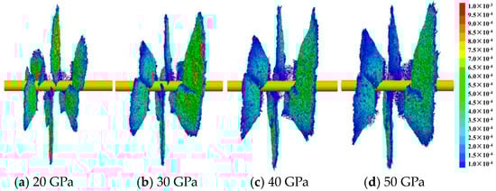 To investigate the impact of different formation elastic moduli on fracture initiation and propagation, fracture propagation morphology simulations were conducted with elastic moduli set to 20 GPa, 30 GPa, 40 GPa, and 50 GPa, as shown in Figure 13 and Figure 14. It was evident that depth-controlled oriented perforation ensured uniform initiation of hydraulic fractures in both soft and hard formations. However, for the hard formation, the fracture width was much lower than that of the soft formation, and the fracture area was larger. Figure 15 depicts the variations in pressure curves with different elastic moduli. It is found that with the increase in formation elastic modulus, the initiation pressure of controlled deep perforation increases gradually. What is more, with the increase in formation elastic modulus, directional perforation initiation pressure increased gradually. The highest initiation pressure of 97.45 MPa was observed when the elastic modulus was 50 GPa. Conversely, when the elastic modulus decreased to 20 GPa, the initiation pressure reduced to 94.83 MPa, representing a decrease of 2.6%. The results showed that although the initiation pressure was slightly higher in hard formation, the fracture area was larger, so the controlled depth directional perforation in the hard formation can better stimulate the reservoir.