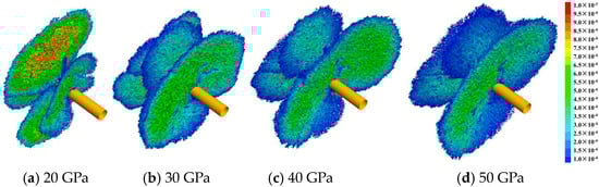 Three-dimensional view of fracture morphology around the wellbore with different elastic moduli at 200 s.