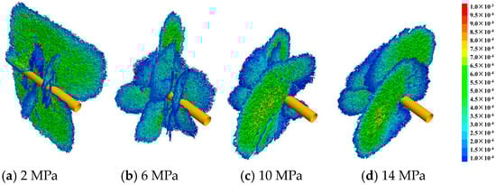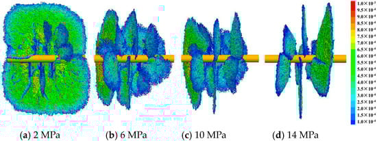 To analyze the effect of horizontal stress differences on fracture initiation pressure, the model considered a minimum horizontal principal stress of 33 MPa and varying maximum horizontal principal stresses of 35 MPa, 39 MPa, 33 MPa, and 47 MPa, respectively. Figure 16 and Figure 17 present the fracture propagation morphology under different stress differences. From Figure 18, when the horizontal stress difference was 2 MPa, the hydraulic fracture initiated along the minimum horizontal principal stress due to the interference between the perforation. As the fracture propagated, it tended to change direction under varying horizontal stress differences. As the horizontal stress difference increased, the connectivity between hydraulic fractures gradually diminished. Under high stress difference, each perforation was more likely to form a fracture strictly perpendicular to the direction of the minimum horizontal principal stress and propagate independently, which made the connection between adjacent perforations challenging. Figure 18 shows the influence of horizontal stress difference on initiation pressure. From the figure, it was evident that with the increase in the horizontal stress difference, the initiation pressure increased initially and then decreased. This finding contrasts with the research conclusions of Li et al. [], who suggested a gradual decrease in initiation pressure with an increase in horizontal stress difference. The disparity in results may be attributed to the omission of perforation interference in Li et al.’s model [].