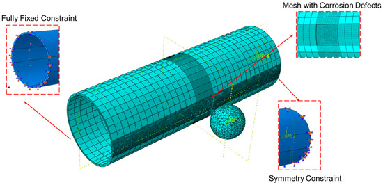 To accommodate the supercritical phase transport of CO2, the internal pressure of the pipeline must be maintained above the critical pressure (7.38 MPa). The high internal pressure significantly impacts the safe operation of the pipeline. In the model, pressure is applied to the inner wall of the pipeline to simulate the working pressure. Additionally, to define the movement direction of the pipeline and rockfall, boundary conditions are set with fixed constraints at both ends of the pipeline model, and displacement/rotation constraints are applied to the rockfall model. The pipeline model uses C3D8R mesh elements, with finer meshing applied to the defect areas; the rockfall model uses C3D10M mesh elements, and the model is partitioned to facilitate mesh convergence [22,23], as shown in Figure 3. To save computation time, a coarser mesh is used for areas other than the pipeline defects, balancing computational accuracy with time cost to some extent.
