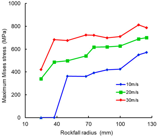 The rockfall impact velocity was set as a single variable with a stepped variation in impact velocities of 5 m/s, 10 m/s, 15 m/s, 20 m/s, 25 m/s, and 30 m/s, resulting in a total of six conditions. Based on these six conditions, rockfall radii of 50 mm, 75 mm, and 150 mm were used to represent monotonically increasing rockfall masses. When the corrosion defect area is fixed and the rockfall impact point is at the center of the defect, the relationship between the maximum Mises stress in the pipeline and rockfall mass is shown in Figure 6.