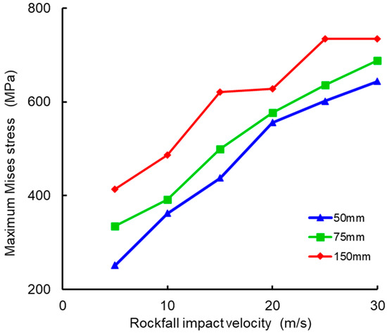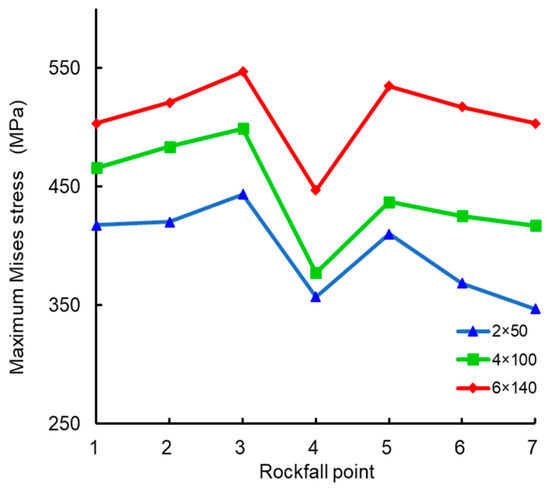 The rockfall impact point was set as a single variable, with seven different impact points designated as ① to ⑦, as shown in Figure 7. Based on these conditions, rockfall radii of 50 mm, 75 mm, and 150 mm were used to represent monotonically increasing rockfall masses. The relationship between the maximum Mises stress in the pipeline and the rockfall impact velocity is shown in Figure 8.