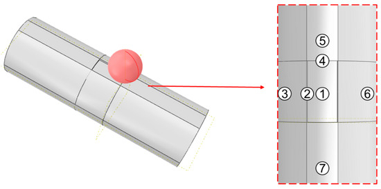 Based on the above principles, a solid model of a SCCO2 pipeline with corrosion defects under rockfall impact is established, and various sensitivity parameters are introduced for analysis. Due to the significant variation in rockfall shapes, the analysis simplifies the rockfall to a spherical shape impacting the pipeline [20], as shown in Figure 2.