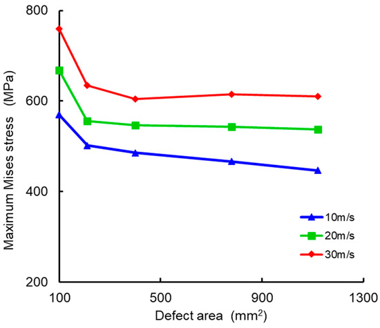 The corrosion defect area was set as a single variable, with rockfall impact velocities varying in a stepped manner, corresponding to five different conditions for corrosion defect areas: 2 × 50 mm2, 3 × 70 mm2, 4 × 100 mm2, 6 × 140 mm2, and 7 × 160 mm2. Based on these conditions, rockfall velocities of 10 m/s, 20 m/s, and 30 m/s were used for the monotonic increasing variable set. When the rockfall mass area is fixed and the impact point is at the center of the defect, the relationship between the maximum Mises stress in the pipeline and the corrosion defect area is shown in Figure 9.