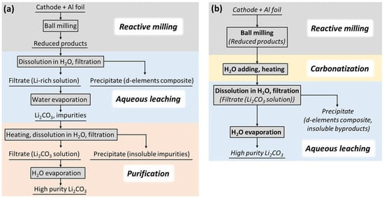 Mechanochemical recovery process (a) process 1 and (b) process 2 flowcharts (reproduced with permission from []).