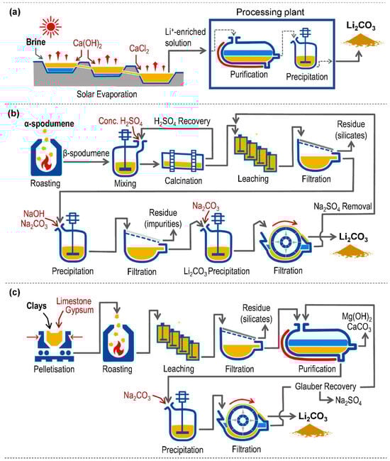 Flowchart of Li ion recovery from (a) salt lake brines, (b) spodumene concentrate, and (c) Li-bearing clay minerals (reproduced with permission from []).