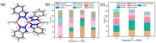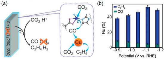 - Liu, C.; Zhang, X.D.; Huang, J.M.; Guan, M.X.; Xu, M.; Gu, Z.Y. In situ reconstruction of Cu–N coordinated MOFs to generate dispersive Cu/Cu2O nanoclusters for selective electroreduction of CO2 to C2H4. ACS Catal. 2022, 12, 15230–15240. [Google Scholar] [CrossRef]