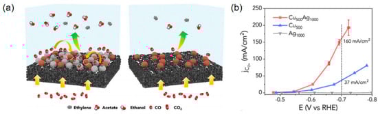 - Chen, C.; Li, Y.; Yu, S.; Louisia, S.; Jin, J.; Li, M.; Yang, P. Cu-Ag tandem catalysts for high-rate CO2 electrolysis toward multicarbons. Joule 2020, 4, 1688–1699. [Google Scholar] [CrossRef]
