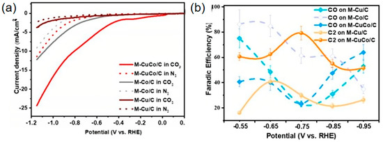 | Co3O4-CuOx/C(M-CuCo/C) | C2+ | 0.1 M KHCO3 | 79.2 | 19.28 | [106] |