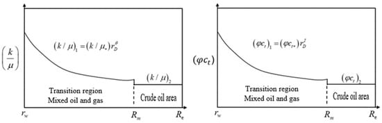 - During the initial gas flooding period, the inner region is considered the transition region. Based on research results on the distribution characteristics of fluid thermodynamic properties, it can be concluded that the fluid mobility and storage coefficient in the transition region exhibit an exponential relationship with radial distance, as shown in Figure 1 and Equations (1) and (2);
