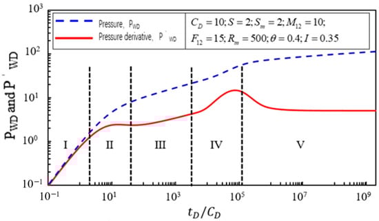 To analyze seepage characteristics during the initial stage of gas injection into an injection well, this section further employs the Stehfest numerical inversion technique to invert the solution of the bottom-hole pressure in Equation (47) under certain parameter conditions, as shown in Figure 3, and obtains dimensionless double-logarithmic bottom-hole pressure dynamic response characteristic curves for the initial real-space bottom-hole pressure and for multicomponent gas injection into the injection well during the initial stage. Analysis of the research results shown in Figure 3 reveals that the typical curves for the pressure and pressure derivative can be divided into five seepage stages: