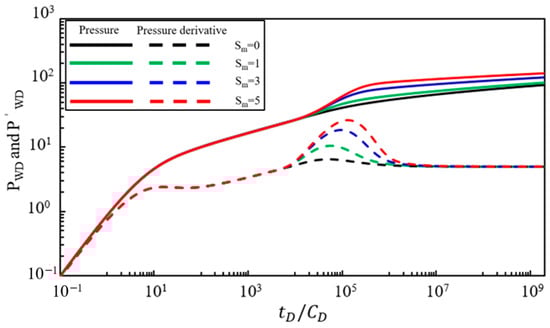 Figure 4 illustrates the effect of additional resistance at the interface between the multicomponent water–gas transition region and the saline aquifer on the dynamic bottom-hole pressure response. With other parameters held constant, the characteristic curves of the pressure and pressure derivative are calculated for the interface skin coefficient at 0, 1, 3, and 5. Analysis of the results in Figure 4 shows that the additional resistance at the transition region and at the saline aquifer interface primarily affects the third, fourth, and fifth flow stages. As the interface skin coefficient increases: (1) The straight line segments of the pressure derivative curve in the third and fifth flow stages become shorter. (2) The upward convexity of the pressure derivative curve during the transitional seepage stage significantly increases. Conversely, the smaller the interface skin coefficient is, the smaller the corresponding additional resistance at the interface is, resulting in a less pronounced upward convexity in the pressure derivative curve and a more gradual transitional seepage stage.