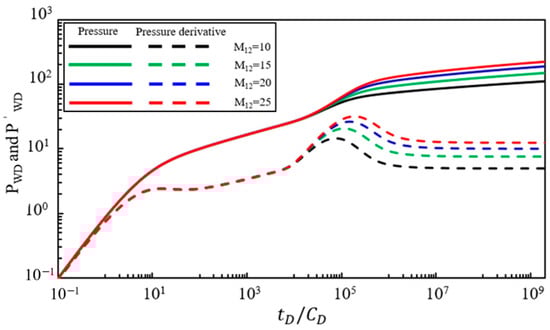 Figure 5 shows the effect of the mobility ratio between the fluid at the bottom of the well and the saline aquifer on the dynamic bottom-hole pressure response. With other parameters held constant, the characteristic curves of pressure and pressure derivative are calculated for mobility ratios of 10, 15, 20, and 25. Analysis of Figure 5 indicates that the mobility ratio primarily affects the fourth and fifth flow stages. As the mobility ratio increases: (1) The pressure derivative value at the extremum points of the transition from the transition region to the saline aquifer (i.e., the fourth stage) increases. (2) The pressure derivative value at the horizontal segment during the radial flow in the saline aquifer (i.e., the fifth stage) increases. Conversely, as the mobility ratio decreases, the extremum points of the pressure derivative during the transition from the multicomponent water–gas transition region to the saline aquifer and the pressure derivative value during the radial flow in the saline aquifer decrease.