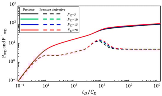The CO2 flow’s leading edge and leakage characteristics can be discriminated through Figure 4, Figure 5, Figure 6, Figure 7, Figure 8, Figure 9, Figure 10 and Figure 11. With different skin coefficients, fluidity ratios, and storage capacity ratios, the variation characteristics of the pressure derivative curves are different, and the CO2 migration distance can be judged according to these characteristics. The boundary feature can determine whether CO2 leakage occurs at the migration front. When the features in Figure 10 are present, this indicates that there is a leak, and when Figure 11 is present, it means that CO2 is not leaking.