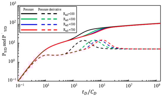 Figure 7 illustrates the impact of the dimensionless radius of the multicomponent water–gas transition region on bottom-hole pressure dynamics. Under constant conditions for other parameters, the pressure and pressure derivative characteristic curves are calculated for a dimensionless radius of 100, 300, 500, and 700. Analysis of Figure 7 shows that the dimensionless radius of the multicomponent water–gas transition region primarily affects the third, fourth, and fifth flow stages. As the dimensionless radius increases: (1) The duration of the multicomponent water–gas’s radial flow extends. (2) The onset of radial flow in the saline region is delayed. (3) The transition flow stage from the transition region to the saline region occurs later.