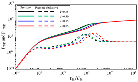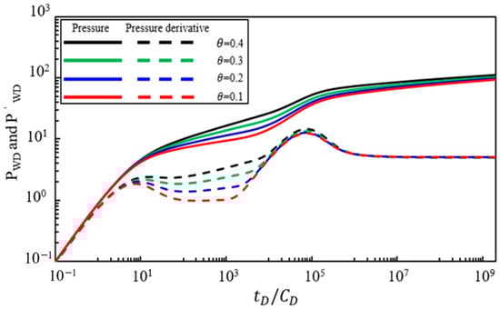 Figure 6 illustrates the effect of the storage capacity ratio at the interface between the fluid at the bottom of the well and the saline aquifer on the dynamic bottom-hole pressure response. With other parameters held constant, the characteristic curves for the pressure and pressure derivative are calculated for storage capacity ratios of 5, 10, 15, and 20. Analysis of Figure 6 indicates that the storage capacity ratio primarily affects the fourth and fifth flow stages. The influence of the storage capacity ratio is similar to that of the mobility ratio . As the storage capacity ratio increases: (1) The extremum point during the transition from the transition region to the saline aquifer becomes larger. (2) The pressure derivative value during the radial flow in the saline aquifer does not show significant changes. Compared to the mobility ratio , the effect of the storage capacity ratio on pressure derivative characteristics is notably weaker.