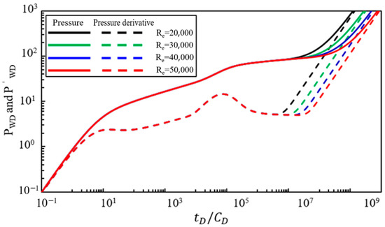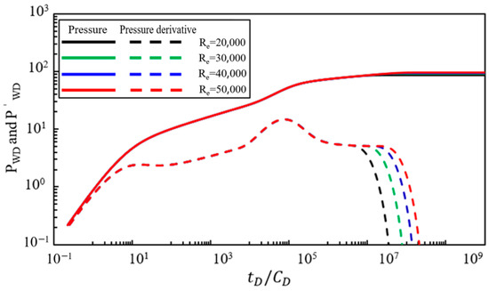 Figure 11 illustrates the impact of the outer circular closed boundary on bottom-hole pressure dynamics. With other parameters held constant, the pressure and pressure derivative characteristic curves are calculated for the closed boundar values of 20,000, 30,000, 40,000, and 50,000, respectively. Analysis of Figure 11 reveals that, similar to the constant pressure boundary, under closed boundary conditions, there is an additional late stable flow stage compared to the infinite reservoir. In this flow stage, both the pressure and pressure derivative curves become sharply rising straight lines with a slope of 45°. The outer closed boundary primarily affects the end time of radial flow in the saline region. A larger closed boundary results in a longer duration of radial saline flow in the reservoir. Conversely, a smaller value leads to an earlier end time for radial flow in the saline region.