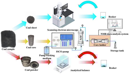 The coal rock samples used in this study are from the 8+9# coal seam in the eastern margin of Ordos Basin. (1) The obtained coal rock is processed in accordance with the national standard GB/T 23561.1-2009 [39], “Methods for the Determination of physical and mechanical properties of coal Rock Part 1: General Provisions for sampling”, and the 5 cm × φ2.5 cm plunger core sample is prepared using a wire-cutting instrument (Suzhou Zhonggu Industrial Co., Ltd., Suzhou, China) (Table 1). (2) The acid solution used to carry out the coal core acid leaching experiment is shown in Table 2. (3) We pulverize, grind, screen and dry coal rock to obtain 80–100-mesh powder coal rock samples for the coal dissolution rate test. (4) The plunger core sample is wire-cut and a coal flake sample with a size of 0.5 cm × φ2.5 cm is prepared for the SEM experiment.