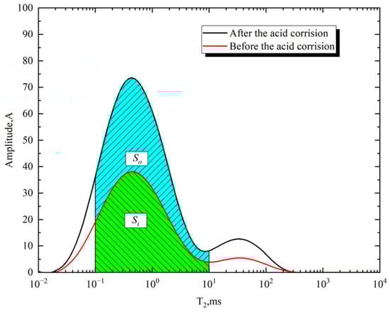 Supposing that, in the process of the acid solution experiment, the effective pore throat volume before the application of a solution of 0.10–10.00 ms is represented by (Si), and the effective pore throat volume after solution’s application is represented by (So + Si), then the pore volume growth rate b is calculated as follows: